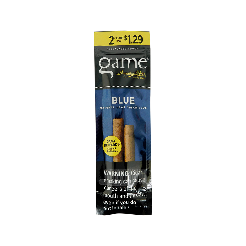 Game Blue Cigarillos offer a smooth blend of natural vanilla and premium tobacco, wrapped for a consistent burn and texture. These mild, sweet cigars are perfect for a relaxed smoke and come in packs of two, sealed for freshness. Made in the USA.
